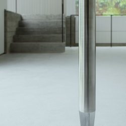Below the longitudinal beam of the intermediate volume of air, we set an ultra-thin solid stainless steel column, which not only acts as a swing column to help hold up the longest beam in the whole interior space, but also even serves to pull the roof down during typhoon. In addition to its concrete structural role, it also connects the flying beam overhead to the flesh of the experiencer, transforming the abstract visual experience into the tactile sensation of holding the column in the hand. More essentially is the relationship to the only square fixed window on the facade – when an experiencer faces the window, standing against the pillar, he faces the direction of the sea beyond the tree canopy.