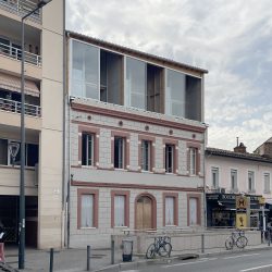 Le projet consiste en la surélévation d’un immeuble de faubourg à Toulouse. La surélévation est réalisée en ossature bois afin de minimiser la surcharge des fondations et des murs porteurs du bâtiment existant. Cinq logements en duplex sont construits selon un dispositif constructif en mur ossature bois préfabriqué. Des dispositifs thermiques viennent donner une qualité d’usage aux appartement. Les parties communes constituent un puit de jour et de ventilation au cœur du projet afin de ventiler naturellement les appartements. Une double peau vitrée sur le boulevard des Minimes vient créer un tampon thermique qui protège et isole les logements exposés ouest. Cet espace intermédiaire augmente les espaces utilisable à la mi-saison.