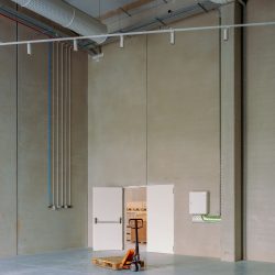 A shop for motorcycle sports, navigation hardware and software development. Office space, cafeteria and living area.