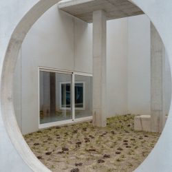 Granite pavement and walls, made of local rocks, sustain the topography and create a continuous floor to visually detach the concrete mammoth.